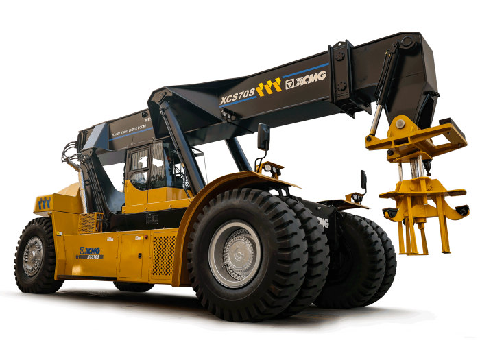 XCS70S吊鈎型正面吊,起重能力提升為4米70噸。本風電正面吊車長12.5米,軸距9米,重量95噸,雙機起吊可滿足最大140噸塔統轉運需求。